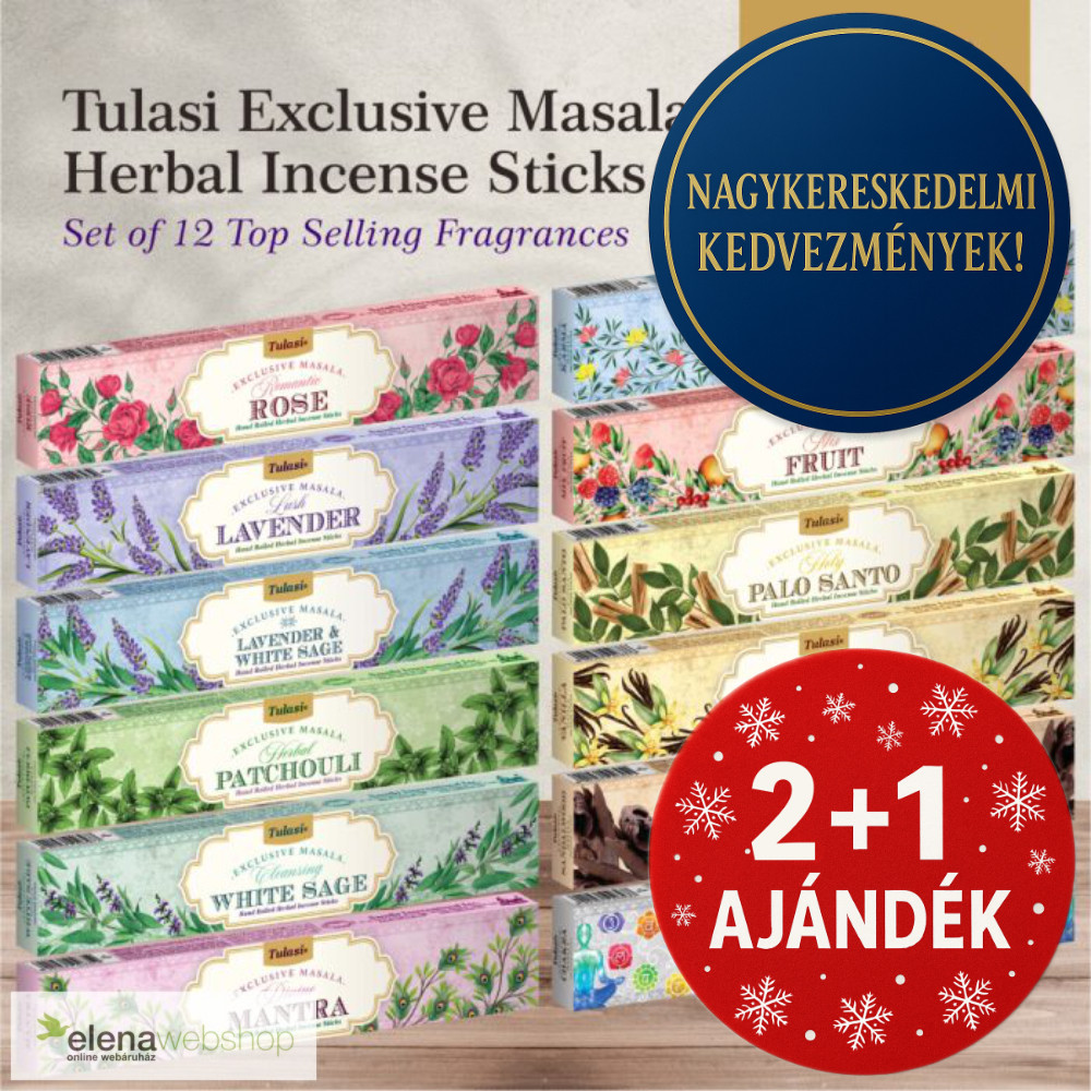 Tulasi Exclusive Masala füstölők - 12 legkeresettebb illatos készlet (15 füstölő / illat, 180 füstölő öszesen) a következő illatokkal a készletben: