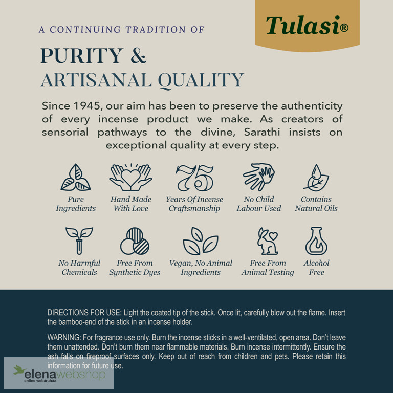 Kézzel készített kézművesség: Kiváló minőségű olajokból, egyedileg kézzel sodorva, ami lehetővé teszi a vastagságban való enyhe eltéréseket. Indiában készült hagyományos technikákkal, biztosítva a hosszabb élettartamú füstölőket. Sokoldalú felhasználás és előnyök: Ideális mindennapi használatra, istentiszteletre, rendezvényekre, aromaterápiára, meditációra, gyógyításra, jógára és sok másra. Elősegíti az együttérzés, a jólét, a belső béke, a relaxáció és a fokozott vitalitás érzését.